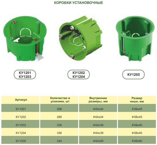 КУ1205и с переходником для соединения-7055 сум фирменный товар Внутренние размеры-Ø 64 x 59 мм Размер ниши-Ø 68 x 60 мм Конструкция-металлические лапки Количество в упаковке-240 шт Максимальный Ø трубы-20 мм Количество вводов-6 шт Материал - полипропилен с добавками, огнестойкость 850°C. Степень защиты IP30. для установки розеток и выключателей