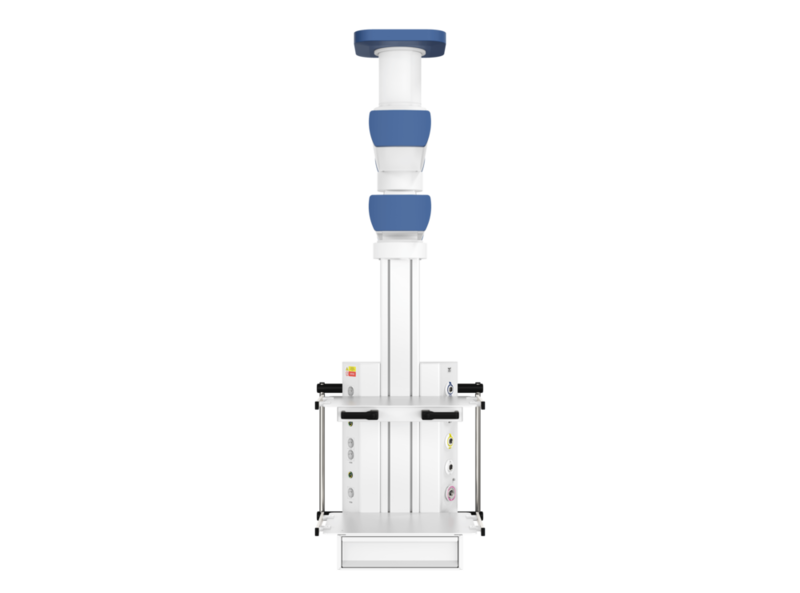 Потолочная двухплечевая медицинская консоль CADUCEUS (Кадуцей) C2E-V уникальная подвесная система жизнеобеспечения, представленная в виде вертикального шкафа источников медицинских газов и электропитания, закрепленного на вертикальной, вращающейся на поворотно-подъемном механизме, колонне. Консоль предназначена для использования в хирургических отделениях и отделениях интенсивной терапии, родовых залах и реанимационных палатах.