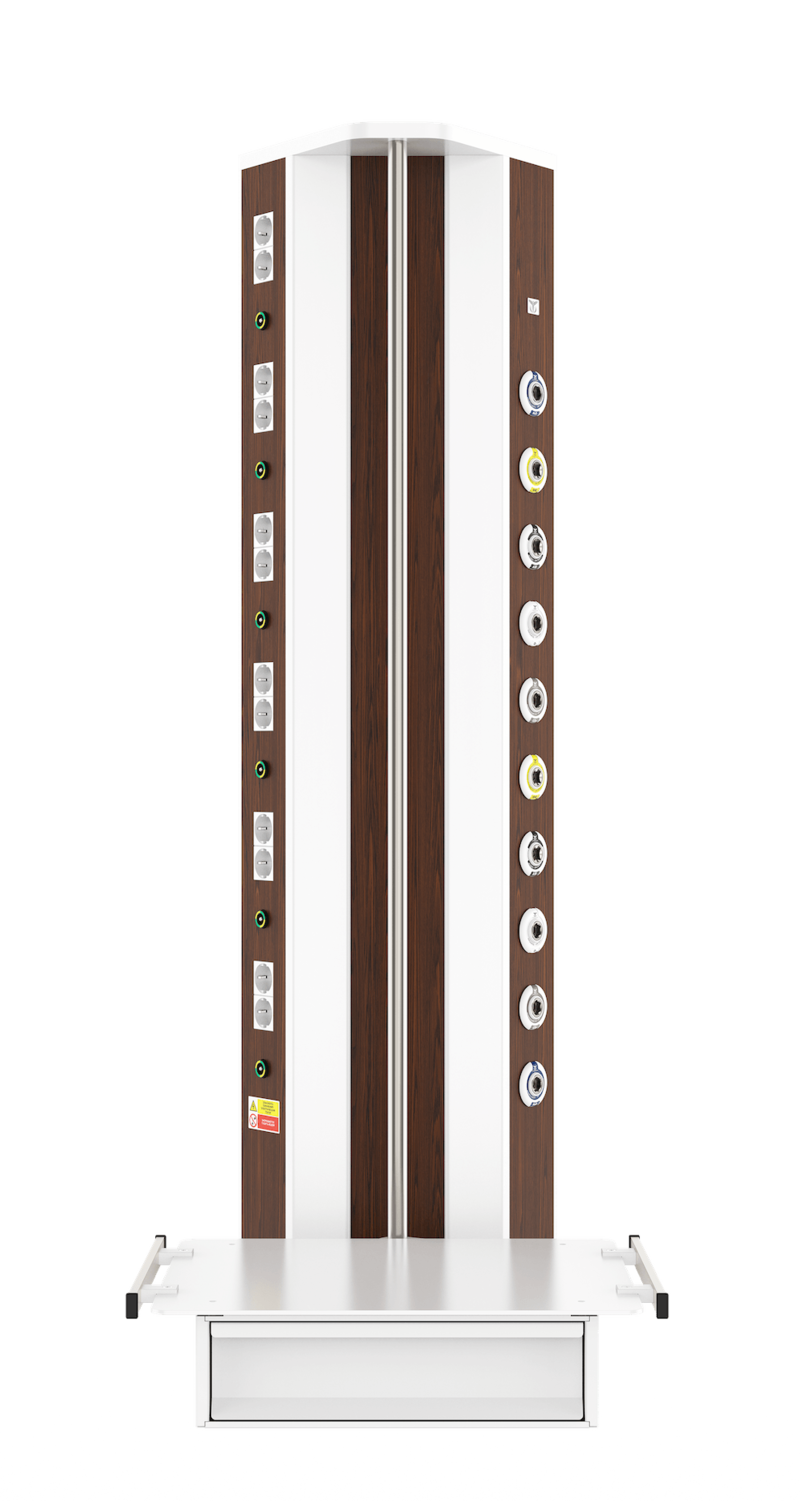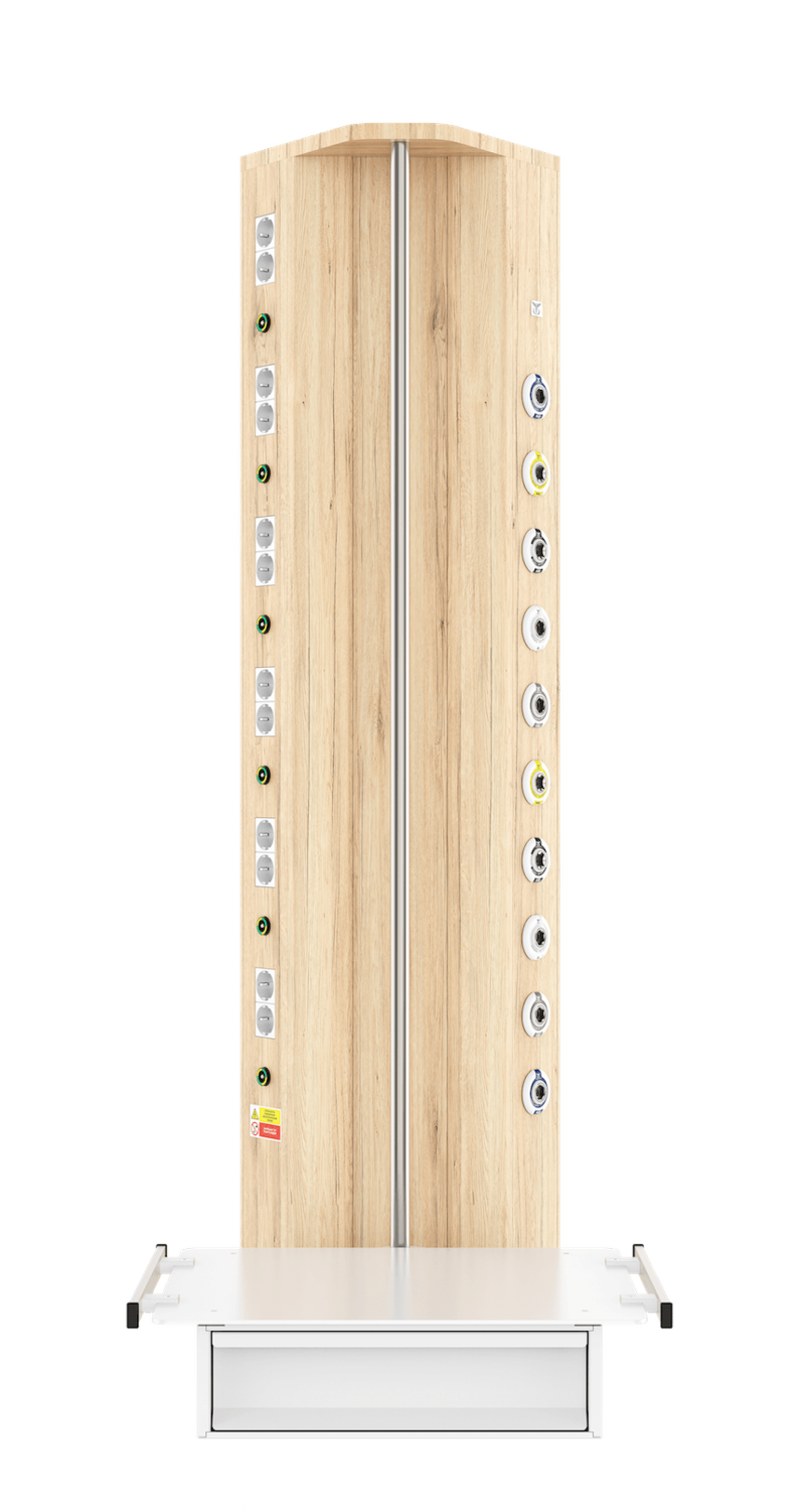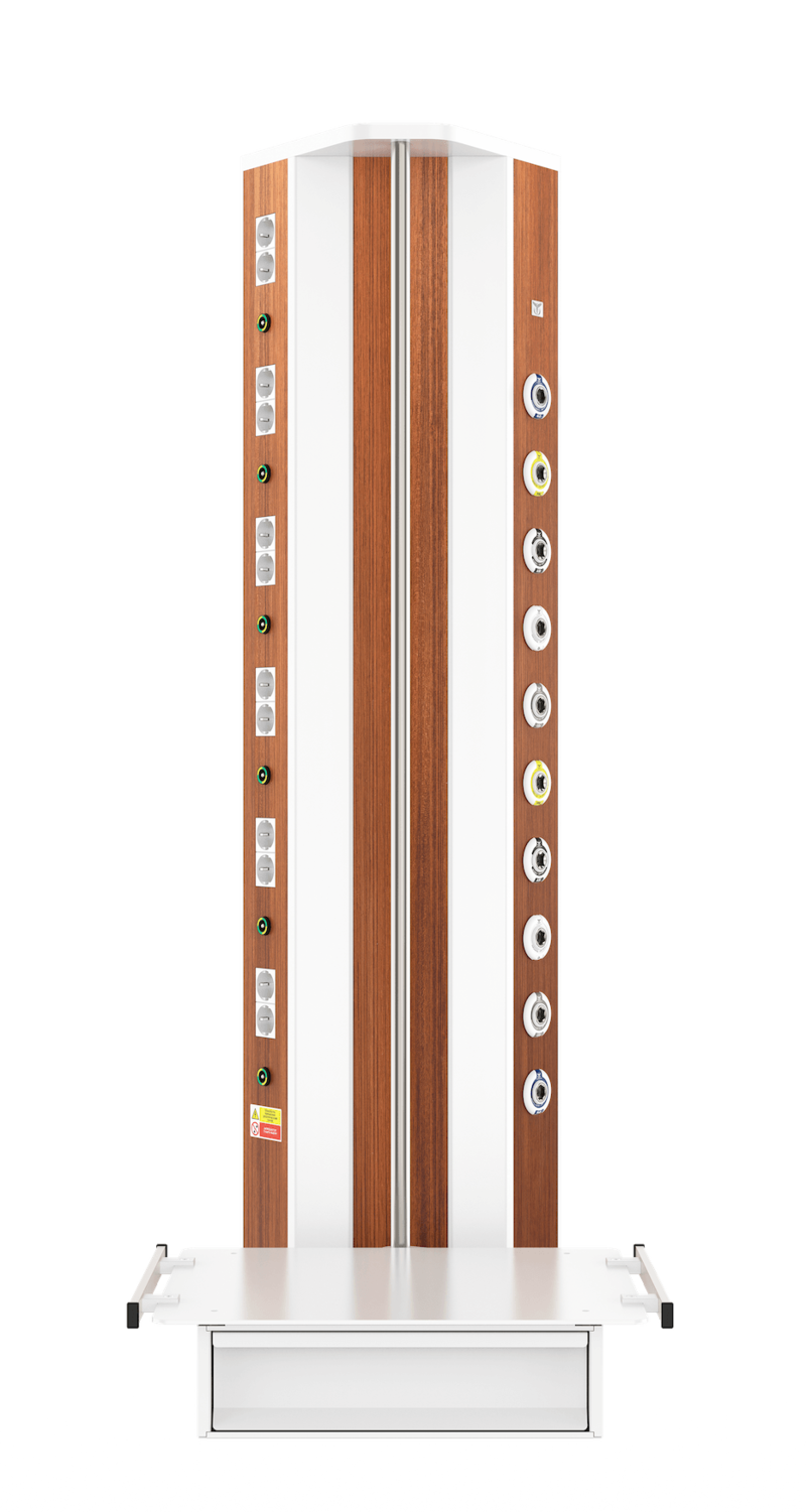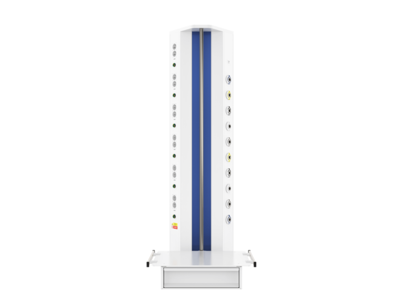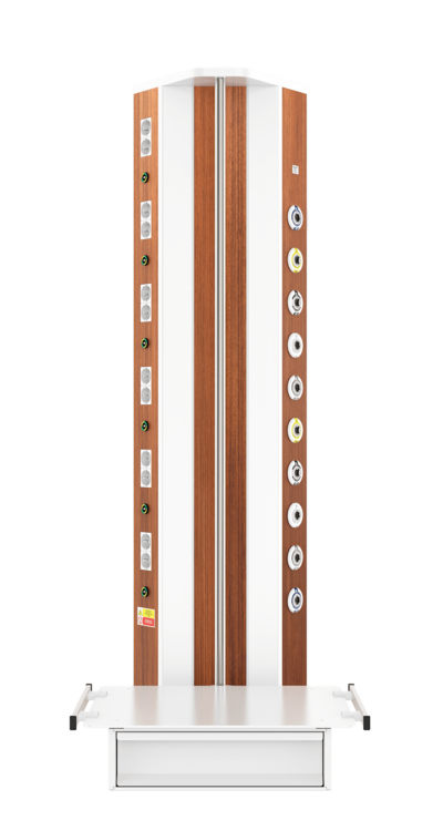 Вертикальная медицинская настенная консоль CADUCEUS CS07L используется для помещений, где невозможно установить горизонтальную консоль с необходимым функционалом. Изделие от других модификаций отличается наличием поворотной полки (полок), что позволяет максимально удобно размещать вспомогательное оборудование на консоли даже в стесненных условиях.